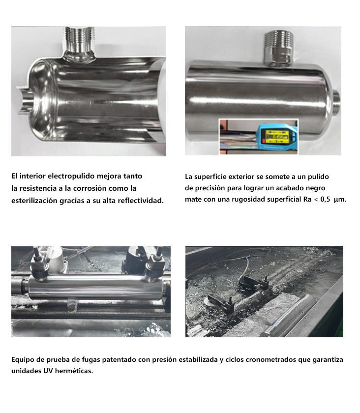 - Tratamiento de superficie e interior: Pulido espejo combinado con pulido electrolítico que aumenta la reflectividad UVC de la cámara, mejorando la eficiencia de esterilización.