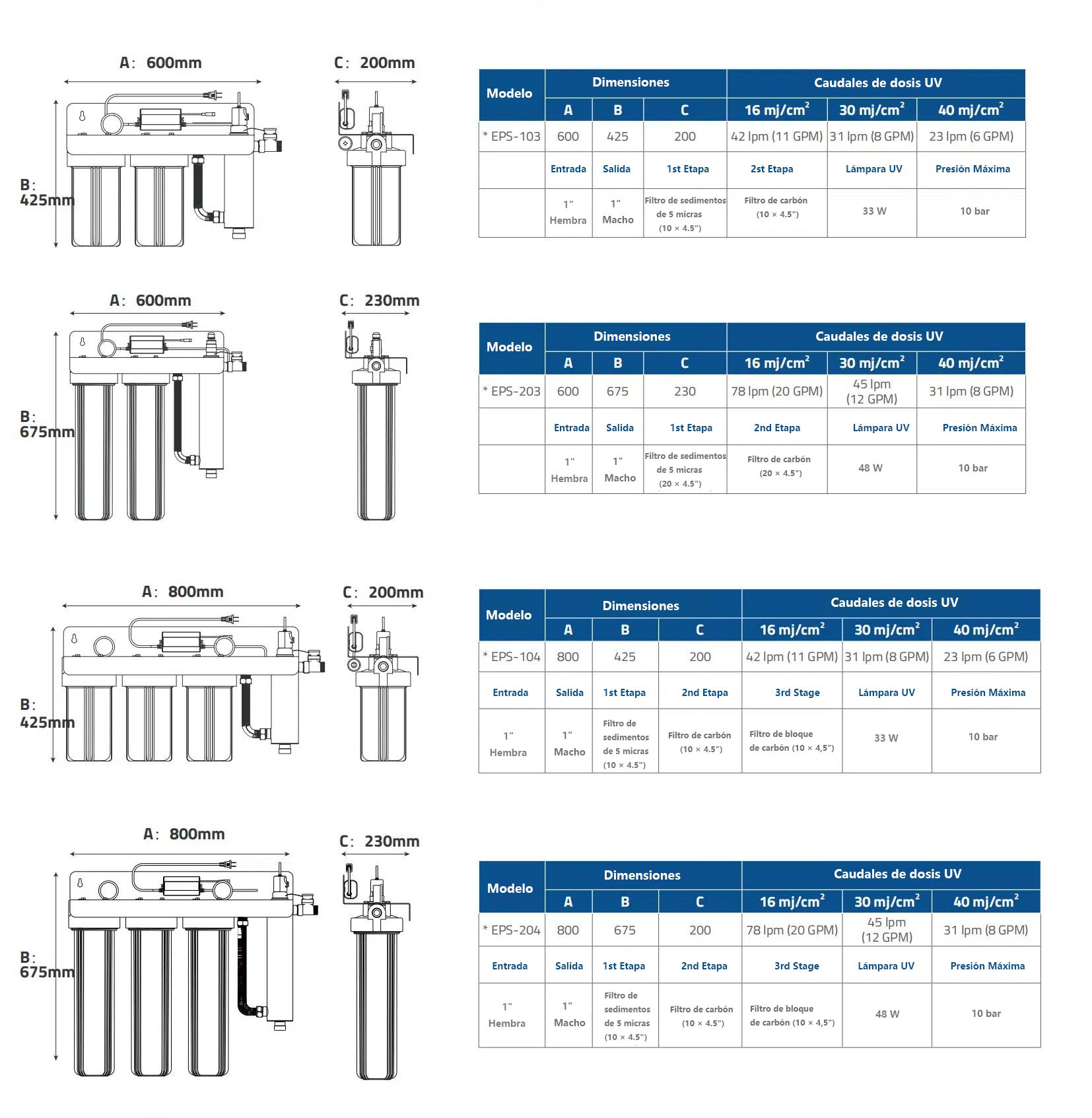 Además, el producto está equipado con un manómetro para la monitorización en tiempo real de la presión del sistema, así como con un balasto con contador regresivo que permite controlar la vida útil de la lámpara UV e incorpora funciones de protección ante fallos.