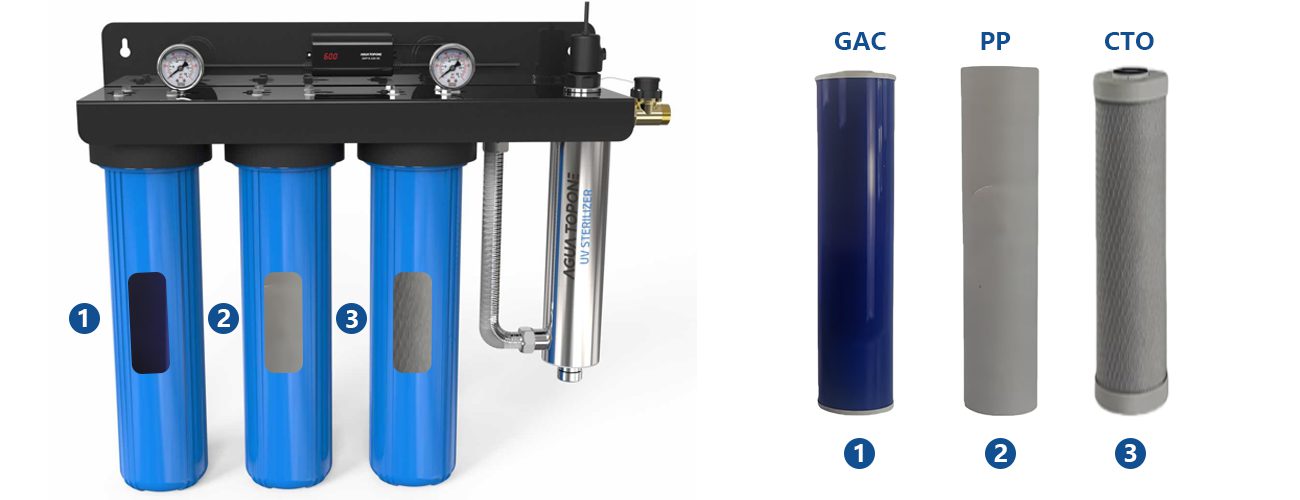 Diseñado para la purificación de agua de toda la vivienda, este equipo de tratamiento de agua destaca por integrar un sistema de filtración con luz ultravioleta. Los cartuchos filtrantes azules del sistema permiten eliminar partículas grandes, sólidos en suspensión y el olor a cloro del agua. Posteriormente, el filtro UV ubicado en la etapa final del equipo inactiva bacterias, virus y otros microorganismos, garantizando la seguridad de todo el sistema de suministro de agua.