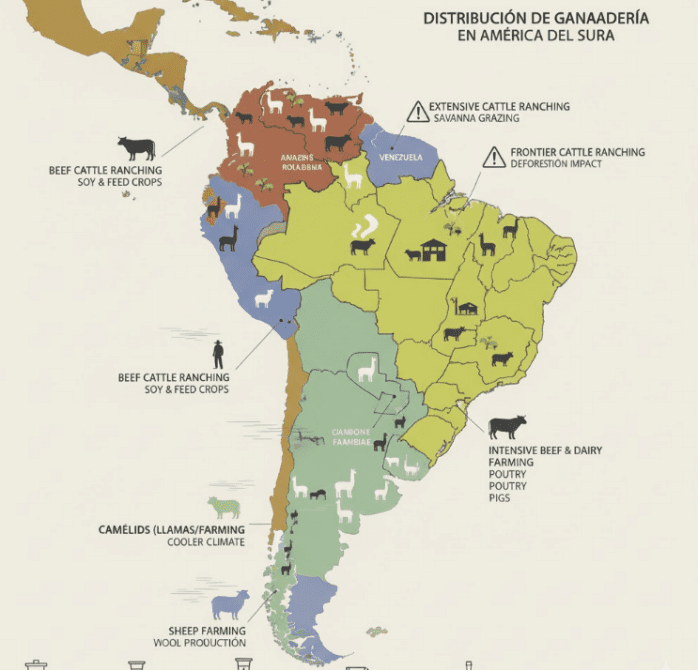 En América del Sur, la ganadería es un pilar fundamental de la economía agrícola. Brasil, Argentina y Uruguay cuentan con extensas áreas de pastoreo y son importantes exportadores mundiales de carne de res y carne de ave; mientras que Chile y Perú destacan en la acuicultura.