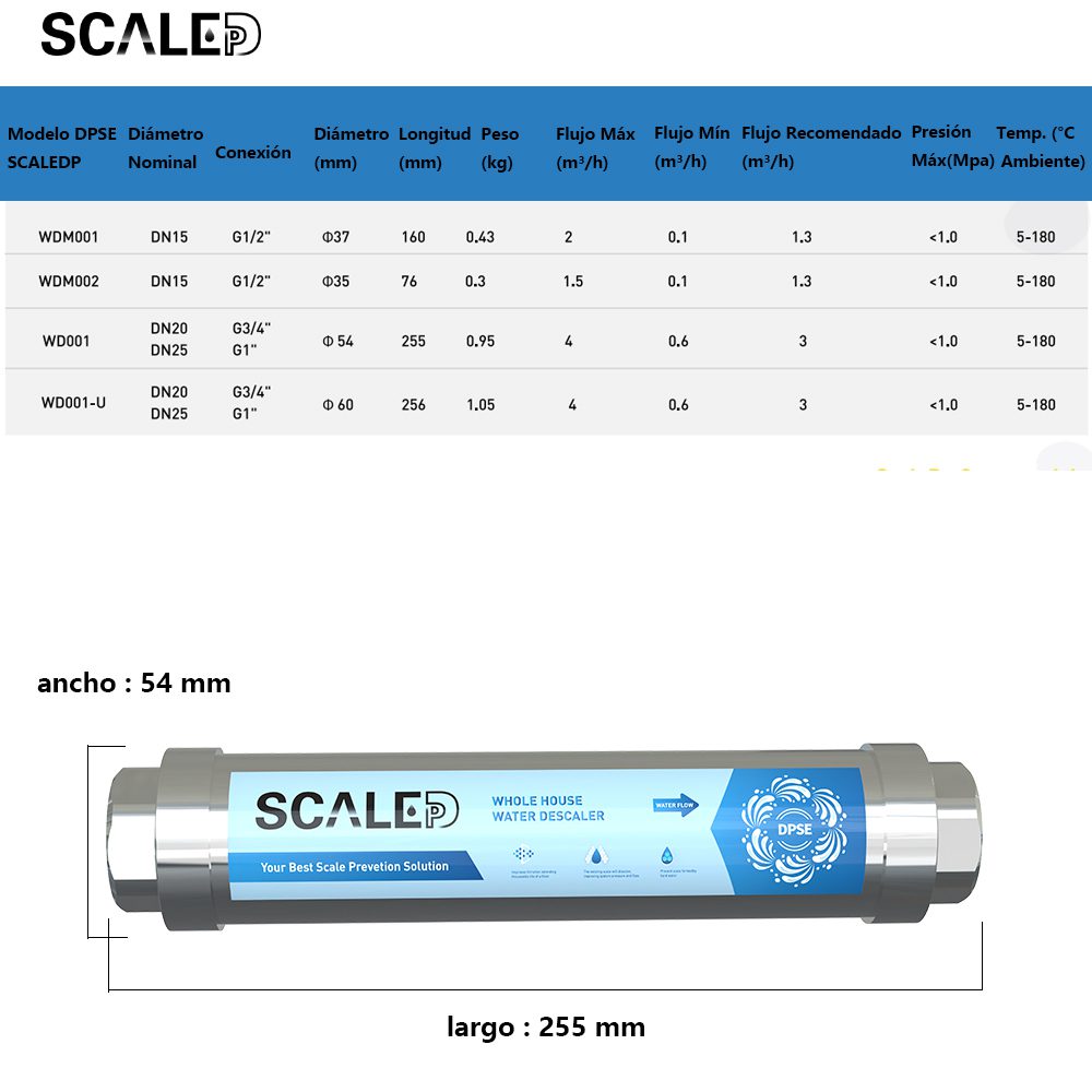 Este dispositivo es un sistema de tratamiento de agua completamente físico que no requiere ningún tipo de producto químico para prevenir y eliminar la incrustación de cal. Su diseño en línea incorpora una rosca interna de 1 pulgada, lo que permite una instalación rápida y sencilla en la tubería principal de entrada de agua.