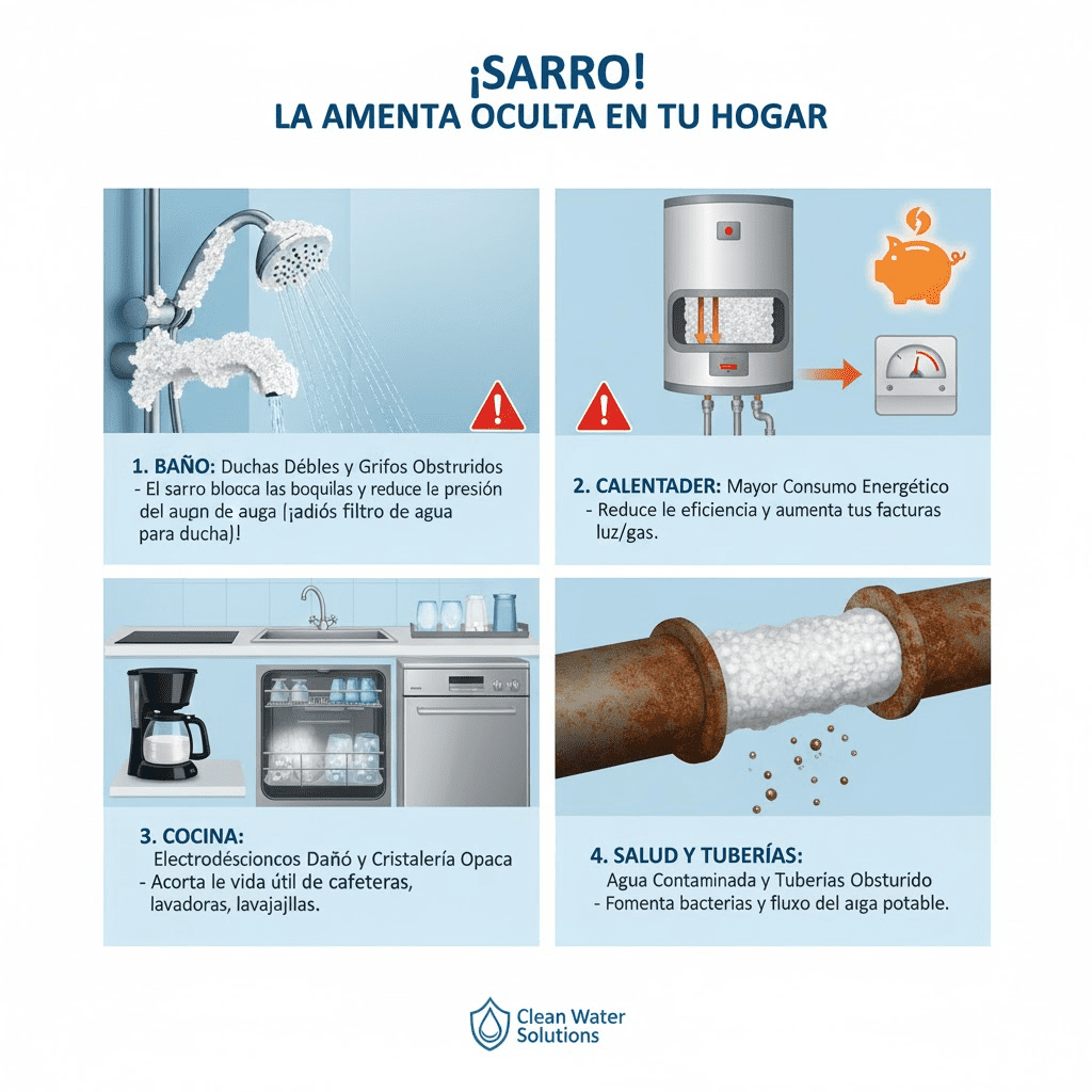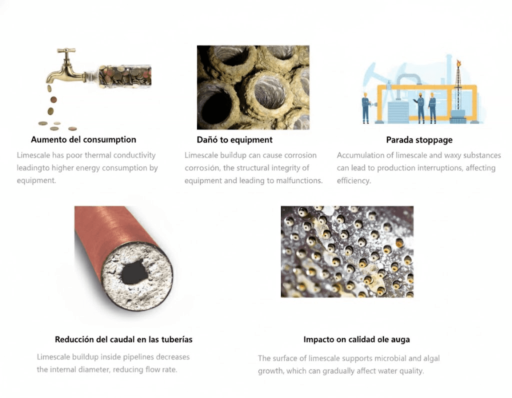La acumulación de sarro (principalmente carbonato de calcio y magnesio) afecta fundamentalmente la eficiencia y la vida útil de los equipos que utilizan agua.