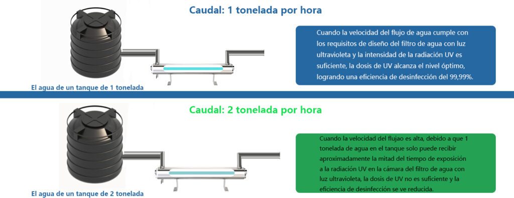 • Si el caudal es lento: El agua pasa más tiempo en la cámara, recibe una dosis de UV más alta y la desinfección es superior.