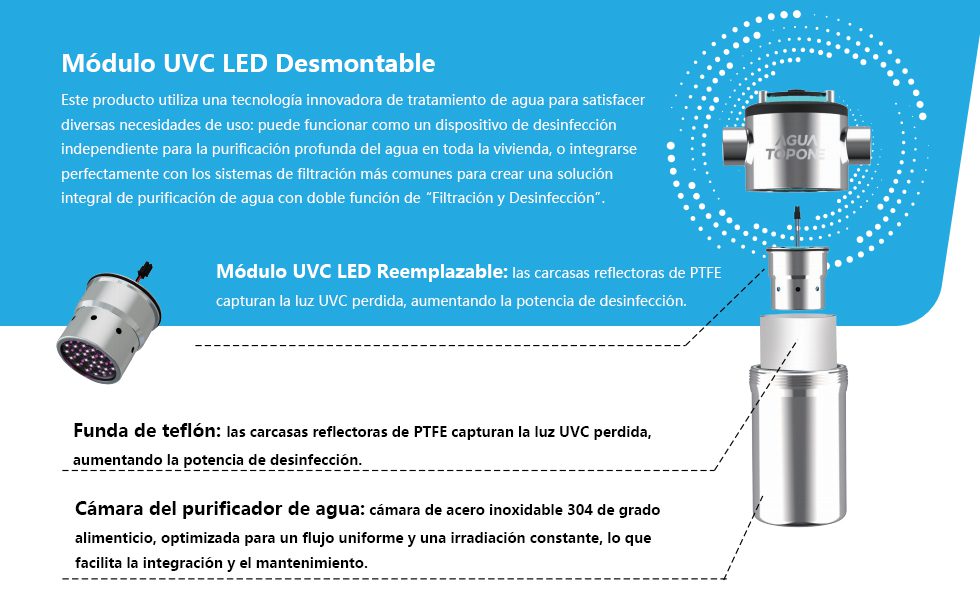 El AGLED-40012 es el producto insignia de Agua Topone y el primer dispositivo en el mundo con módulo UVC LED desmontable. Su diseño permite reemplazar solo el módulo al final de su vida útil, reduciendo costos, simplificando el mantenimiento y extendiendo la vida del equipo.