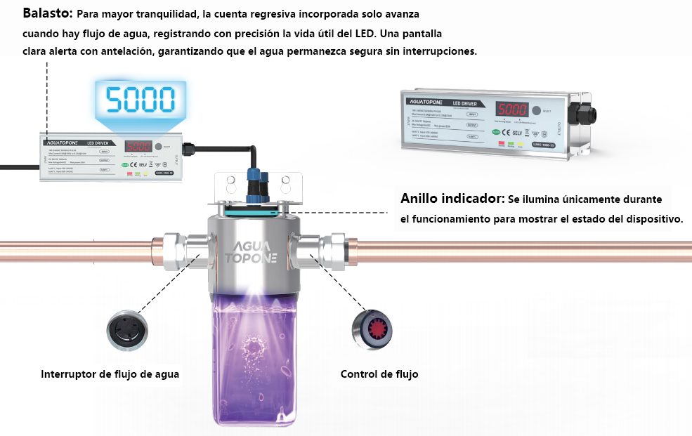 | 6. Alta estabilidad de salida – Mantiene una salida UVC constante incluso en ambientes fríos (como tanques de agua fría o refrigeradores). | Desinfección constante y eficiente. | |
