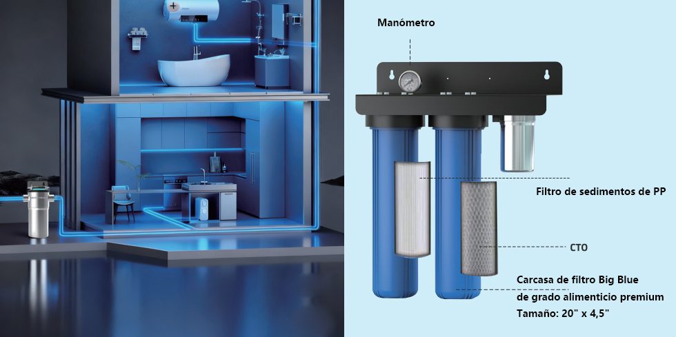 - Integración innovadora: combina pretratamiento con filtros Big Blue de dos etapas y desinfección con UVC LED-40012.