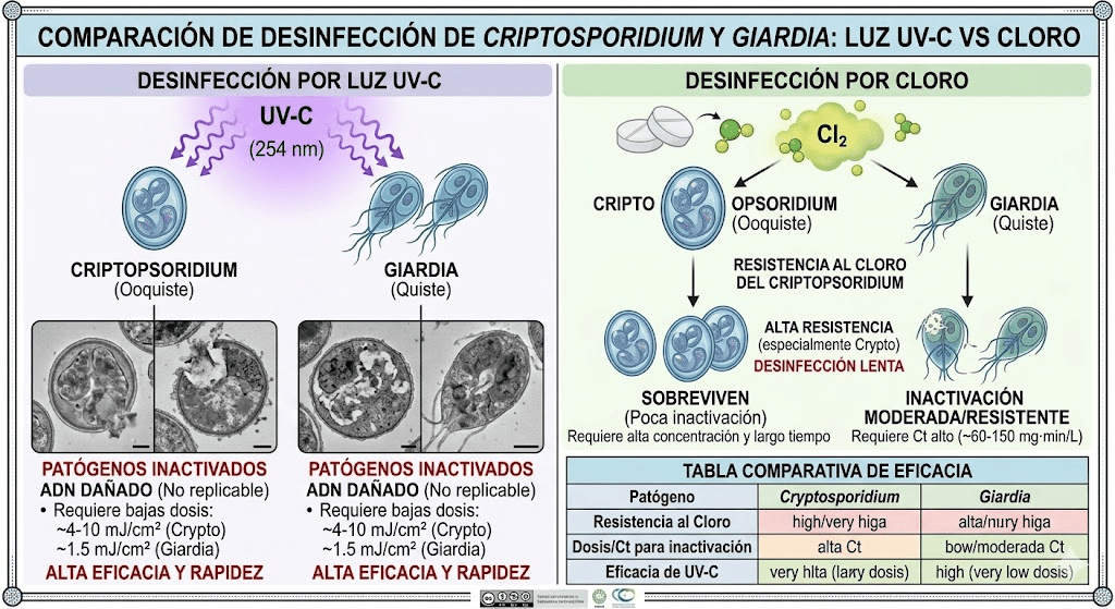 Cryptosporidium y Giardia resisten al cloro pero se inactivan con 10–20 mJ/cm² de luz UV, siendo el UV la opción más eficiente si están presentes.
