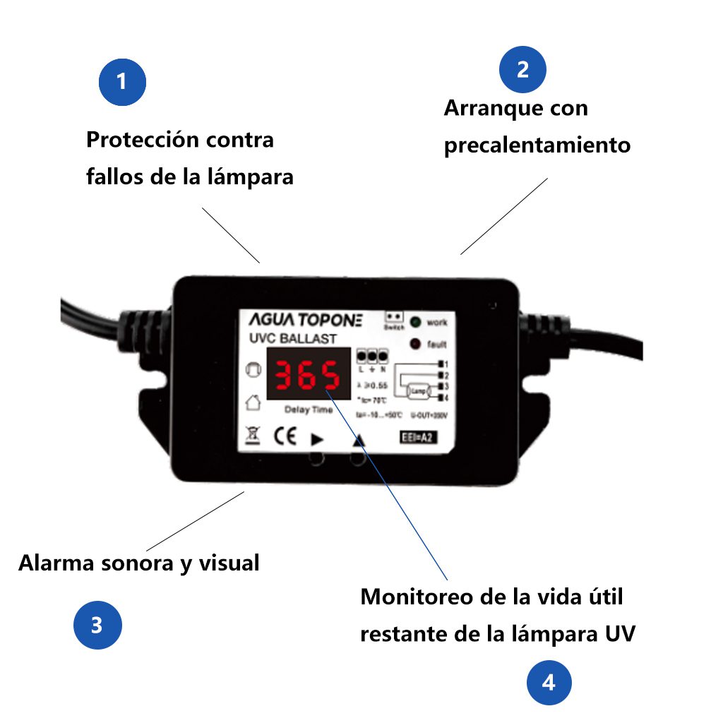 Incluye balastro digital con pantalla, que facilita conocer el tiempo de uso de la lámpara y el momento de reemplazo. Cuenta con arranque con precalentamiento, protección contra fallos de la lámpara, alarma sonora y visual, además de monitoreo del tiempo de trabajo y de la vida útil restante de la lámpara UV, asegurando un funcionamiento más inteligente, seguro y confiable.
