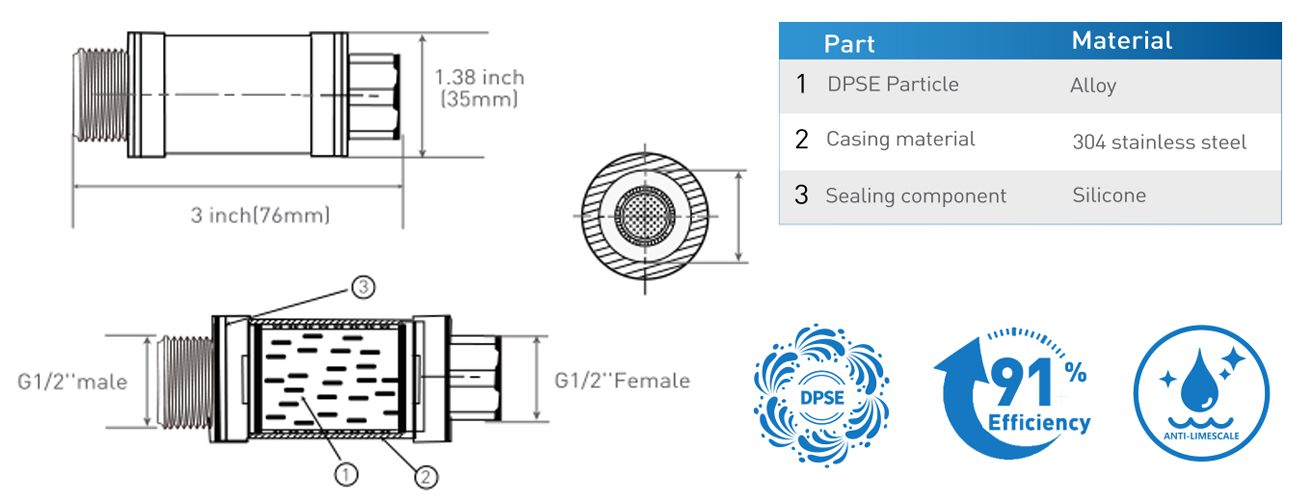 Este dispositivo compacto se integra fácilmente con sistemas existentes sin necesidad de instalaciones adicionales. No requiere sal, productos químicos, mantenimiento ni energía eléctrica. Una vez que el agua fluye a través del filtro, comienza a actuar de inmediato, y en aproximadamente un mes se observan mejoras significativas en la reducción de cal y en la calidad del agua.