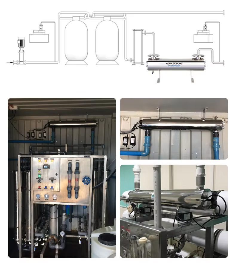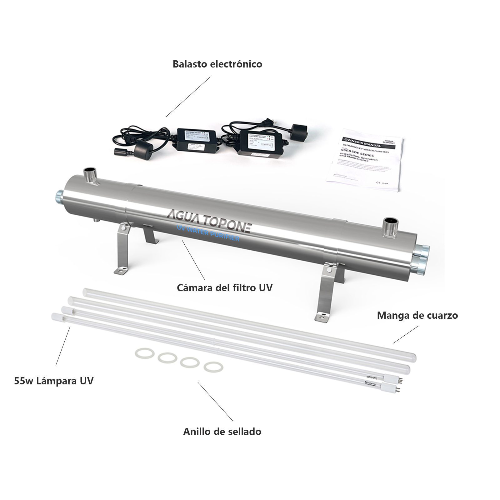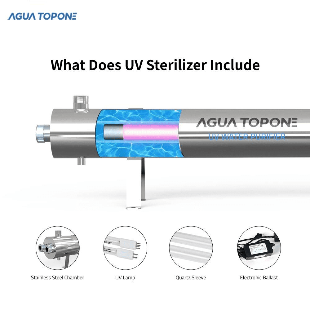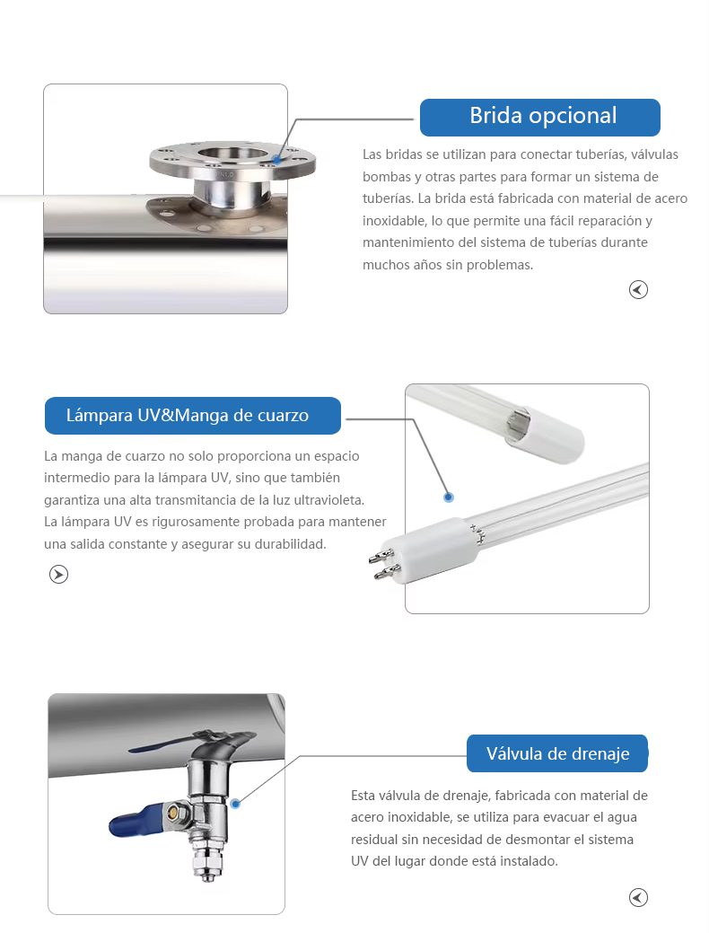 Los sistemas UV generalmente constan de varios componentes clave, incluyendo una cámara de acero inoxidable, una lámpara de desinfección UV, una manga de cuarzo, un balasto electrónico, un O-ring, soportes de montaje, entre otros.