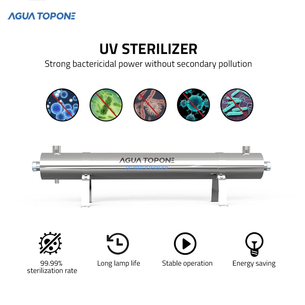 La purificación de agua por ultravioleta (UV) es el método más efectivo para desinfectar las bacterias en el agua. Los rayos UV penetran los patógenos dañinos presentes en el agua de su hogar y destruyen los microorganismos causantes de enfermedades atacando su núcleo genético (ADN). Este proceso es altamente eficiente para eliminar su capacidad de reproducción.